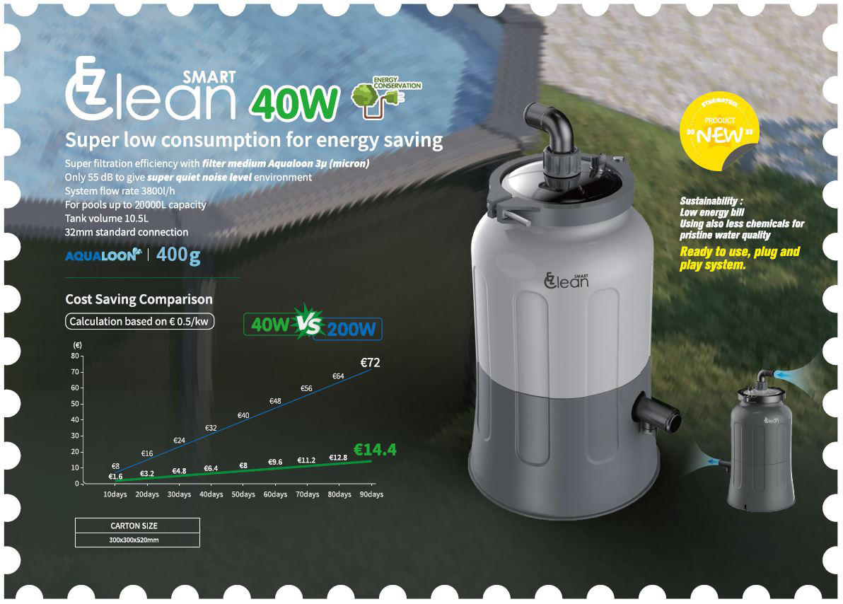 Reningsverket Rio SMART EZ40 är speciellt framtaget för mindre ovanmarkspooler med enkel användning och effektiv vattenrening med extremt låg energiförbrukning. Med endast 40W i timmen ersätter den ett 200W reningsverk för pool upp till 20m³ men förbrukar endast en femtedel i el - spara hela 80%. Spara ännu mer om starkare reningsverk med högre W ersätts. (Poolens vattenvolym ska omsättas minst 3 ggr/dygn, gärna 4-5 gånger.)